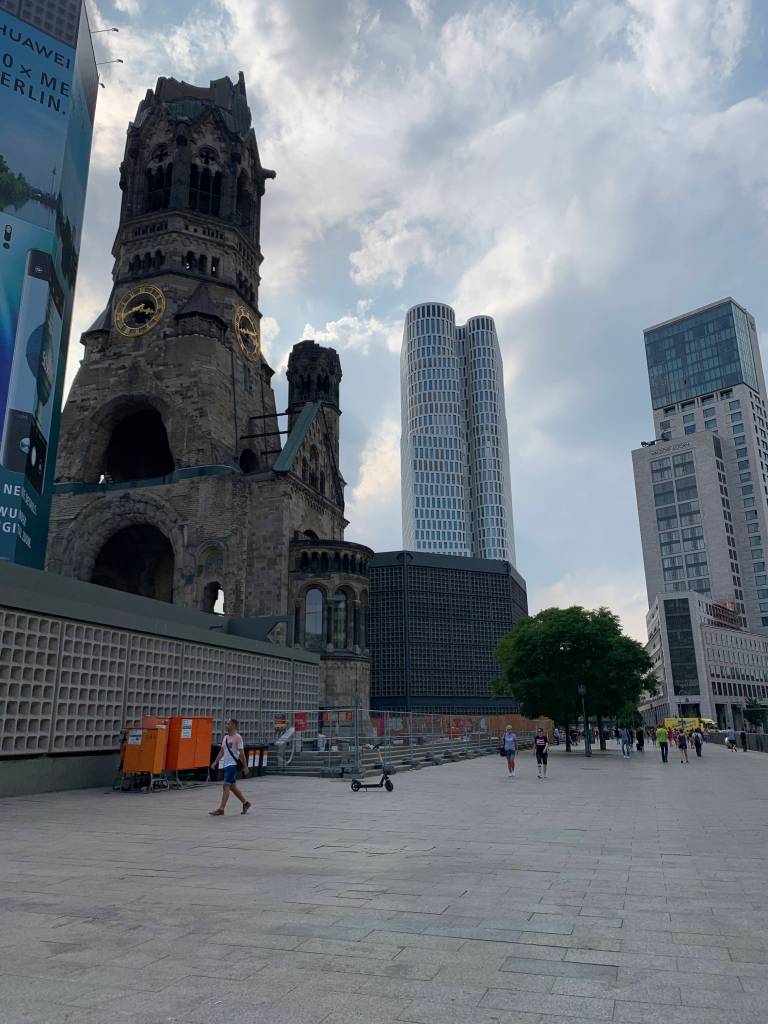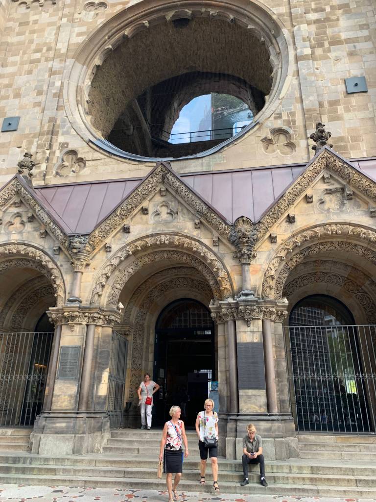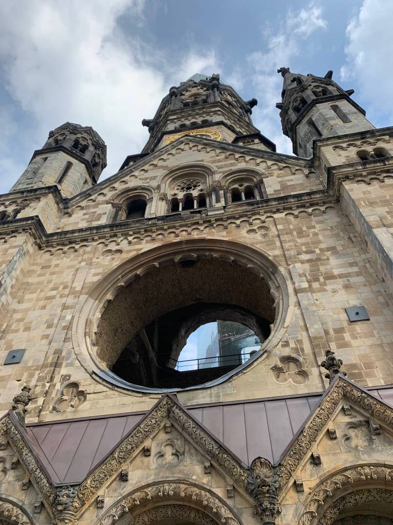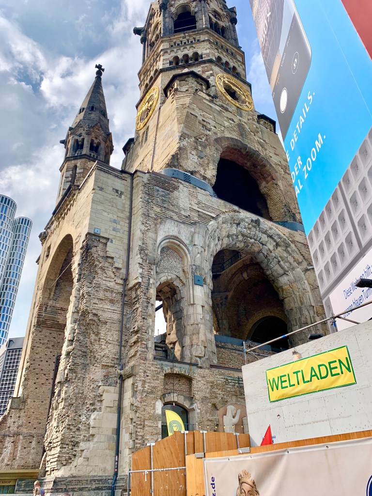Badly damaged during the war, a Protestant church affiliated with the Evangelical Church, constructed in 1891. The odd photo of the steps is a golden crack in the ground in front of the church to commemorate the victims of the December 2016 terrorist attack on a Berlin Christmas market.