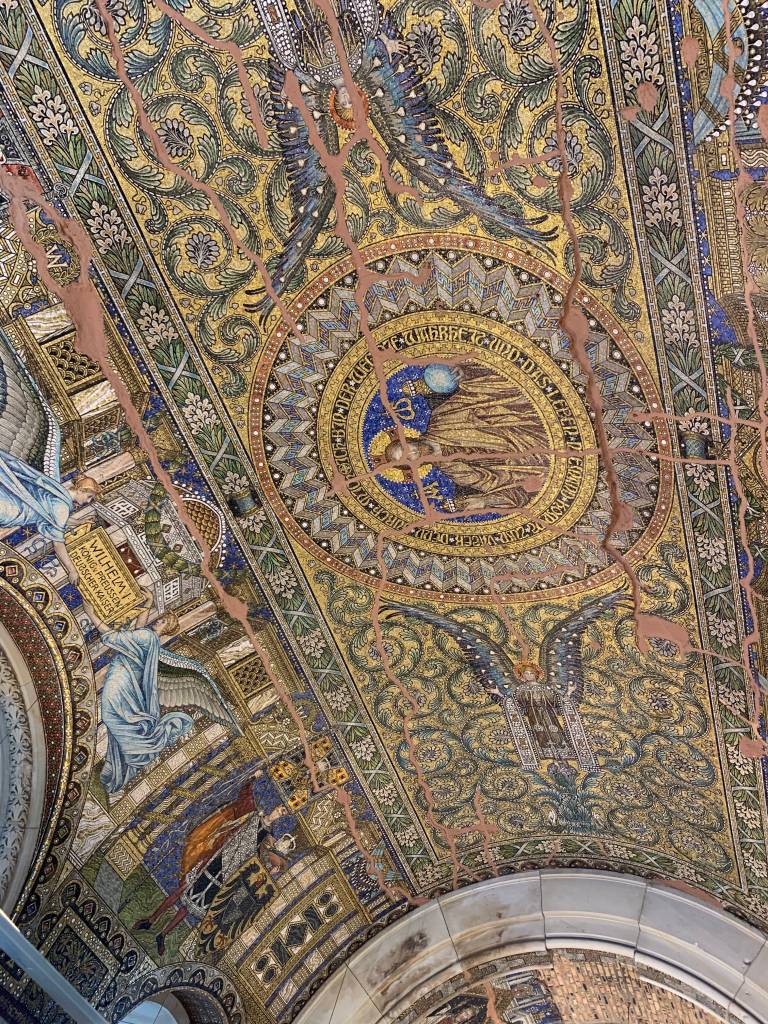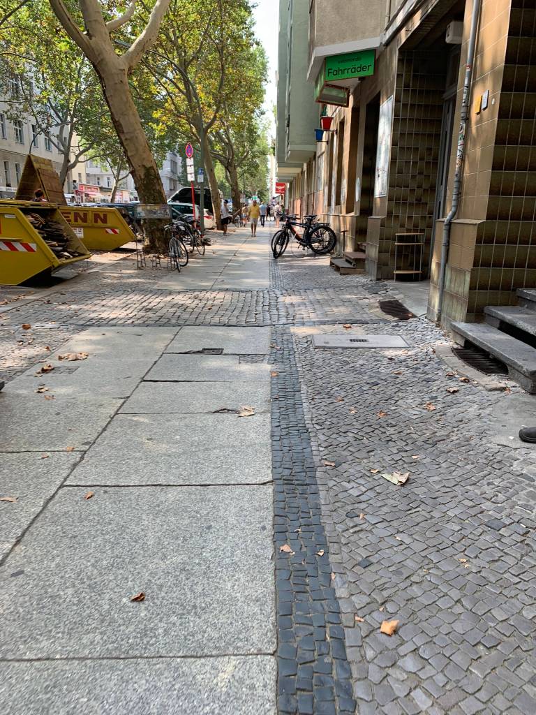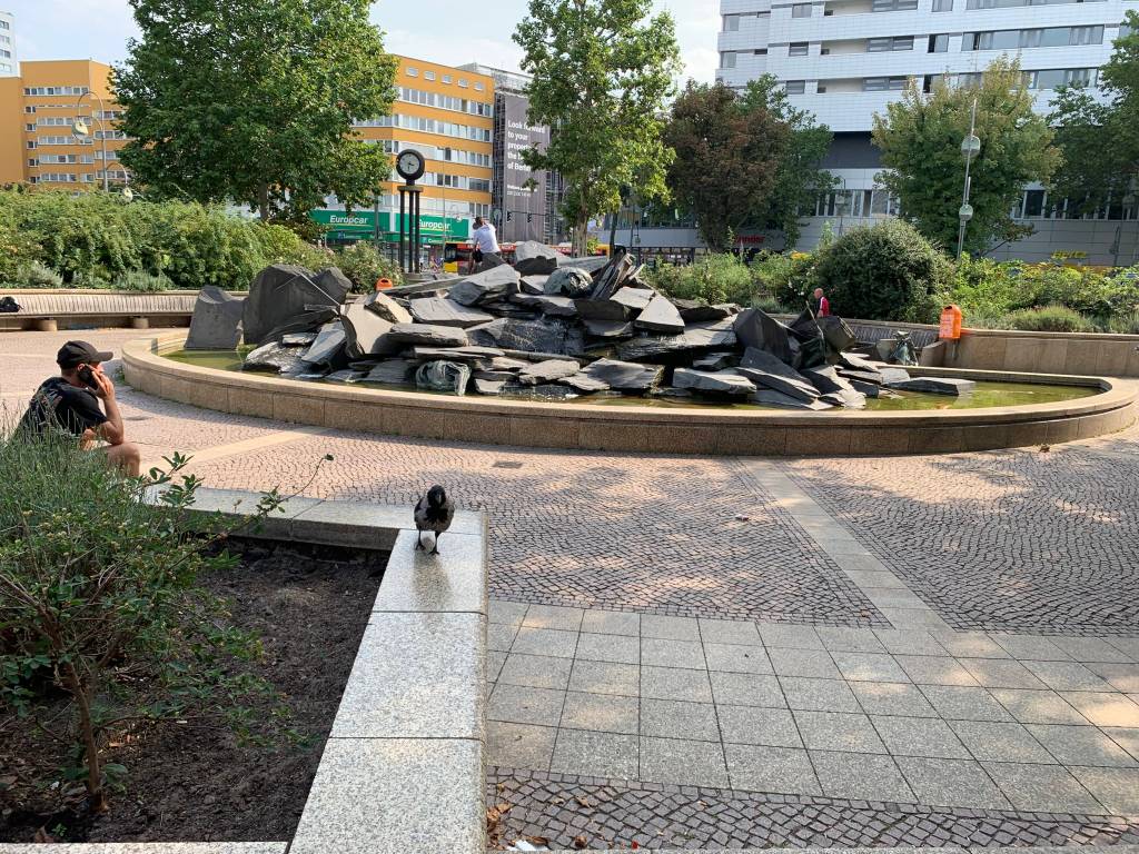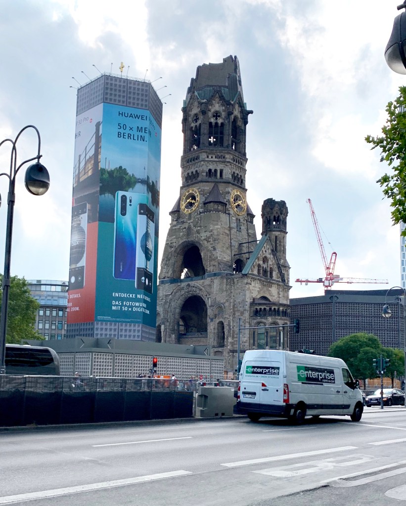 Badly damaged during the war, a Protestant church affiliated with the Evangelical Church, constructed in 1891. The odd photo of the steps is a golden crack in the ground in front of the church to commemorate the victims of the December 2016 terrorist attack on a Berlin Christmas market.