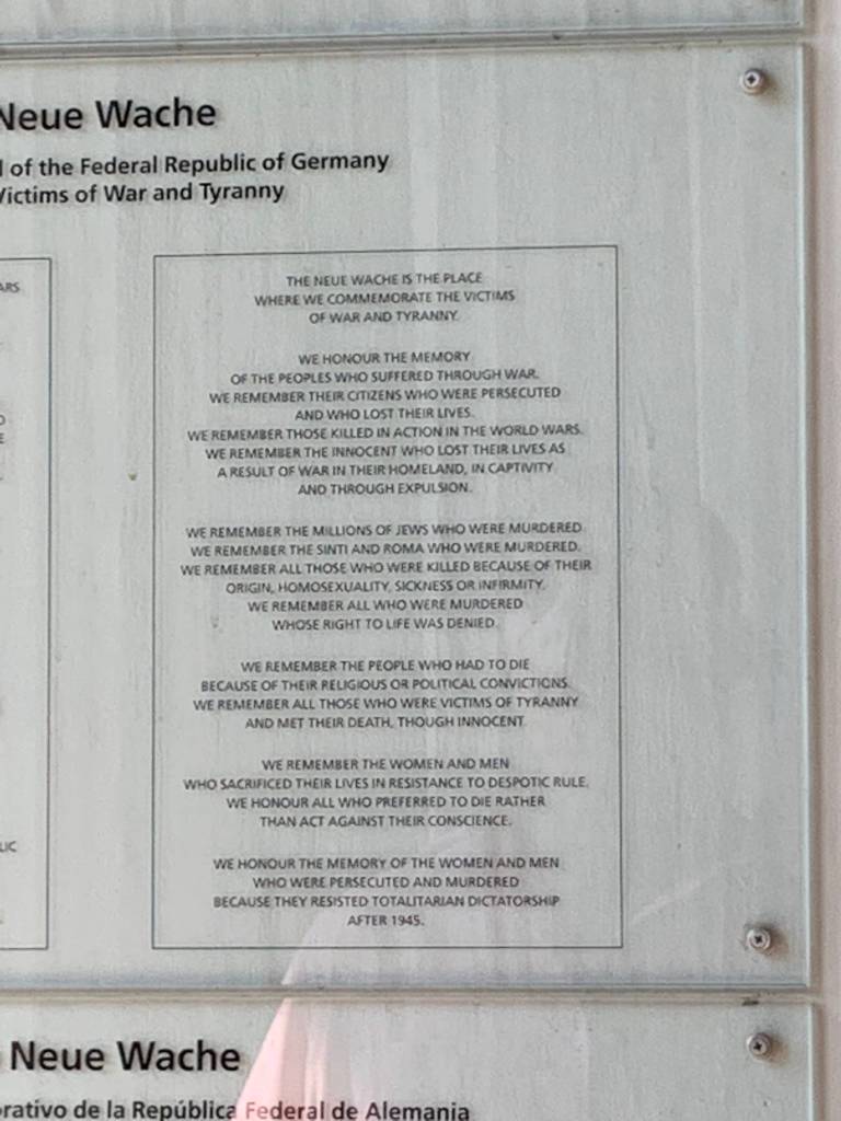 Neue Wache -Serves as the “Central Memorial of the Federal Republic of Germany for the Victims of War and Dictatorship.” I took a photo of the description outside. Heavy place to walk into.