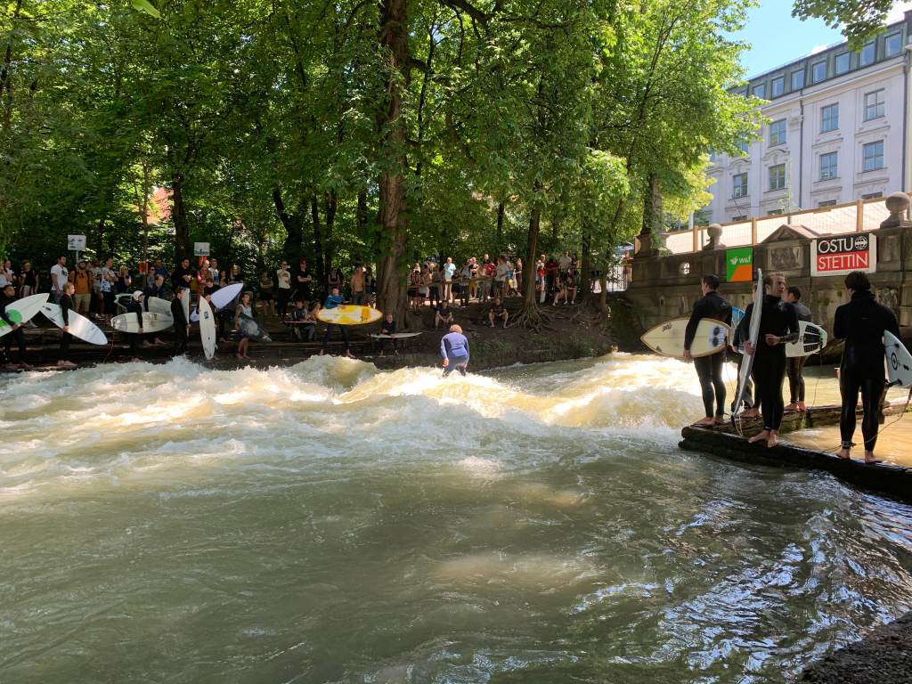 From here I wondered down to Eisbachwelle which was recommended to check out. Surfing, in Europe, in mostly land locked Germany, in Munich, on a river .. what a combination. Its open year-round, but if it’s anything like the water at the Epplesee lake I was at the day before, this water is ice cold. Nonetheless was fun to sit and watch for a while, tons of spectators watching this unusual sport at such an odd location.
