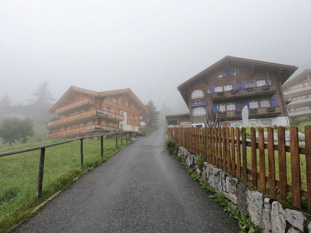 Day two started well, had breakfast at the hotel, packed up my stuff and headed out. Planning for this day was hard because the weather wasn’t going to be great. I was back-and-forth several times if I wanted to go to the cave-like waterfall, or if I wanted to go up to Mürren because the sites are supposed to be fantastic and there’s a four mile hiking loop that’s recommended; so I decided to go up to Mürren for the good hike. I bought a ticket for the cable car and made my way to the lift entrance. There were four Americans on the first ride who were all going to do some hike together; small world. I got off at the first stop, turns out that’s wrong because this is just where you have to change cars to go up to Mürren. So of course, unorganized me got off at this tiny village where there’s only one hundred residents. I didn’t know this wasn’t the right place until five minutes after the gondola took off so I had 30 minutes to kill; I found some pretty horses and cute houses before I got back to the lift and made it up to Mürren. It was super foggy, really I don’t even think I could call it fog, just clouds. So I followed the hiking route anyway because I paid over $20 to come up here; but I got about a mile in and I was just over it. My mood turned south since the weather was so crappy, there was nobody around, I felt like the only human in this small abandoned village which was creepy, and for views purposes there was nothing since I couldn’t see past 200m. I turned around to catch the next ride back down.