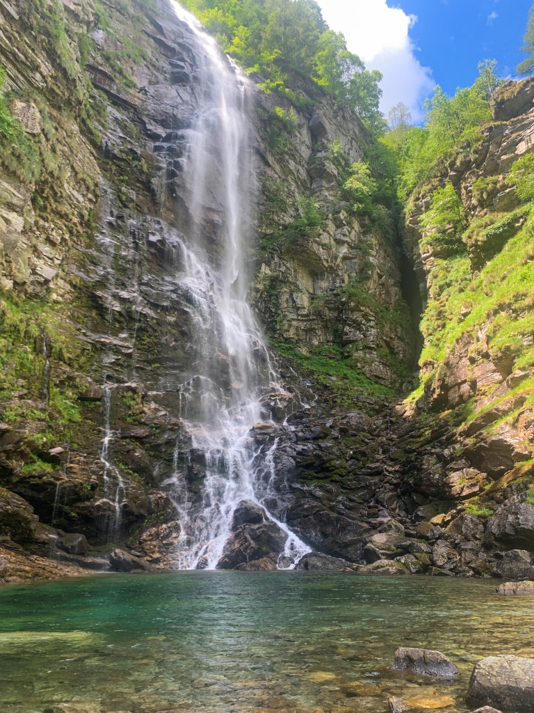 After this quick pit stop I went further down the road. The road here was so awesome, for me atleast. I love tight curving, switchback roads, especially since I took the top of Amos and the sun felt great. I heard of a waterfall all the way up the valley so I went there first before working my way back down the valley throughout the day. The waterfall was outside the town (village) of Sonogno, roughly a mile walk from the town. Here I struggled with paying for the parking meter again so I went to an information building and asked to exchange euros for francs but the wonderful girl showed me their day parking pass for 10Euro which worked anywhere along the valley. Hallelujah. I walked the road out to the waterfall, but I had no idea how great the waterfall until I was fully under it. You could see it for quite a while and no doubt was large, but sitting at the bottom of the pool and feeling the cold mist was truly awesome. The water was COLD so I found a seat in the rocks and enjoyed a snack while I watched a guy from Germany jump in and swim to the falls. I totally would have if someone else would have been with me and I’d had a big towel to dry off. It’s something I would totally go back to and make the effort to swim across it.