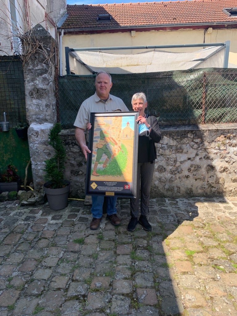 We visited the 1775 bar. This sweet older lady and her husband have a bar, in *, France, dedicated to Marines. Its really special. We all had a beer and then the unit historian donated a large painting to her and establishment of a Marine depicted in uniform from WWI.