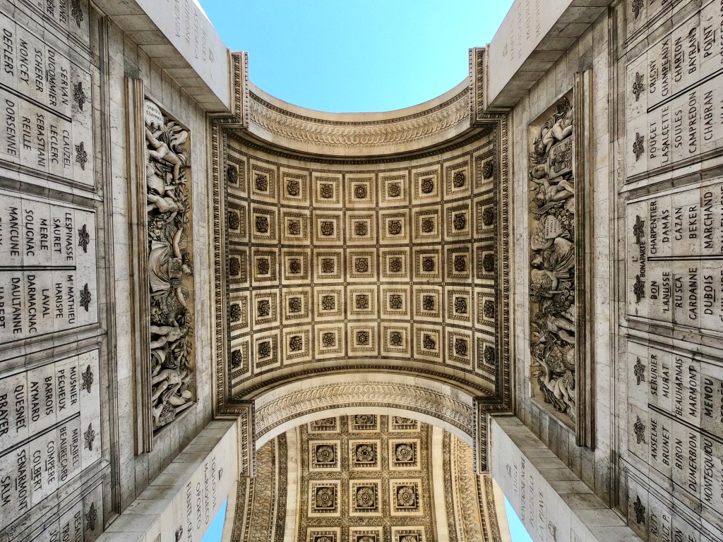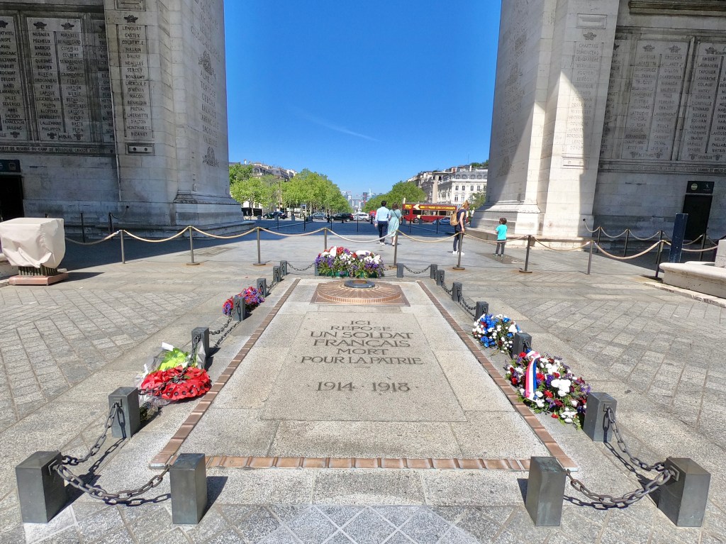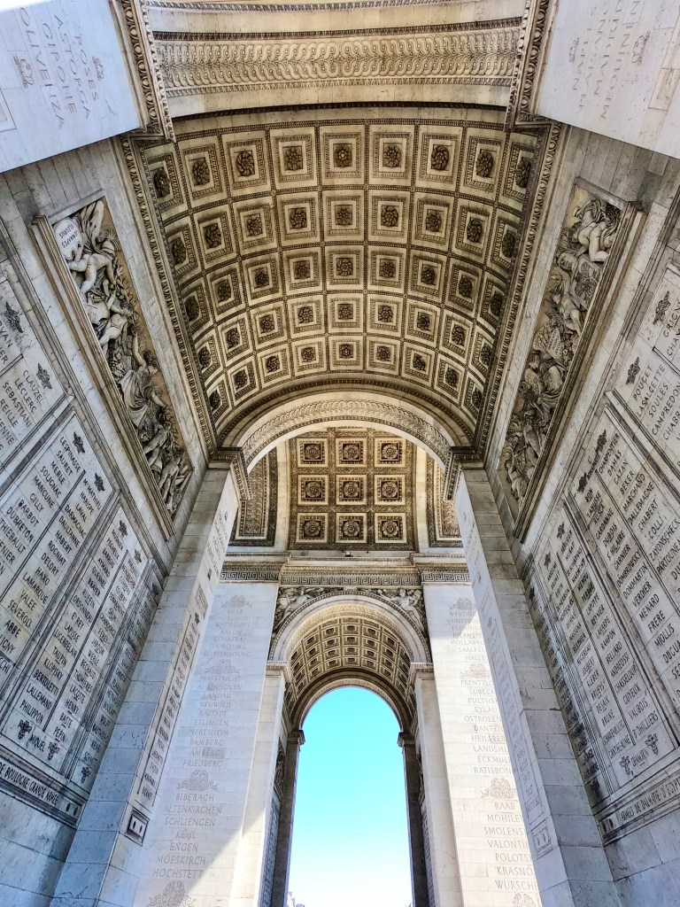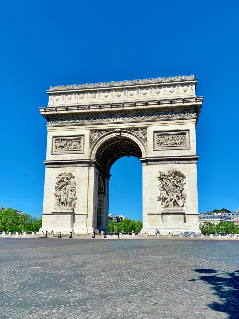 We made it, put away our bikes, and walked to the Arc. Luckily after my experience in Berlin at the victory column I knew there were stairs somewhere to go underground to get to the center of it (never run across the circle of traffic). We found the tunnel and after a bit of confusion, I figured out you can go up for free, but you can also pay for the tour to get into the actual Arc. We got through the tunnel and came out next to the Arc. It’s beautiful (like most things around Europe, yes) but it was ornate details on the structure like things I saw in Athens and I enjoyed taking it all in. There was an eternal fire for a tomb of the unknown soldier. I was surprised to see it here but it was nice to recognize in such a popular area.