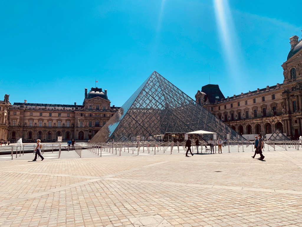 By this time we were getting hot and worn out but we needed to get to the Louvre. Luckily the 2+ mile bike ride was easy since it’s a straight shot and pretty much down all hill. Unfortunately you have to go through the Tuileries Garden, which is a large park and you can’t ride your bike in there. So we pushed our bikes and tried to stay in the shade. I had brought my backpack just for today but didn’t pack my water of course. It was 75 and sunny (I got a good tan from the day) and heat we weren’t used to yet for the year. We finally made it through, patched our bikes and walked under/through some beautiful architecture and to the Louvre. It was very anticlimactic. I was let down surprisingly. The area was smaller than I anticipated and while I was glad it wasn’t busy, it was just dull. You could sort of see inside the glass and see people taking the elevator down into the actual museum, which was under where we were standing. It was cool to know the Mona Lisa was in there but no way I was going to spend the time or money to go see just it.
