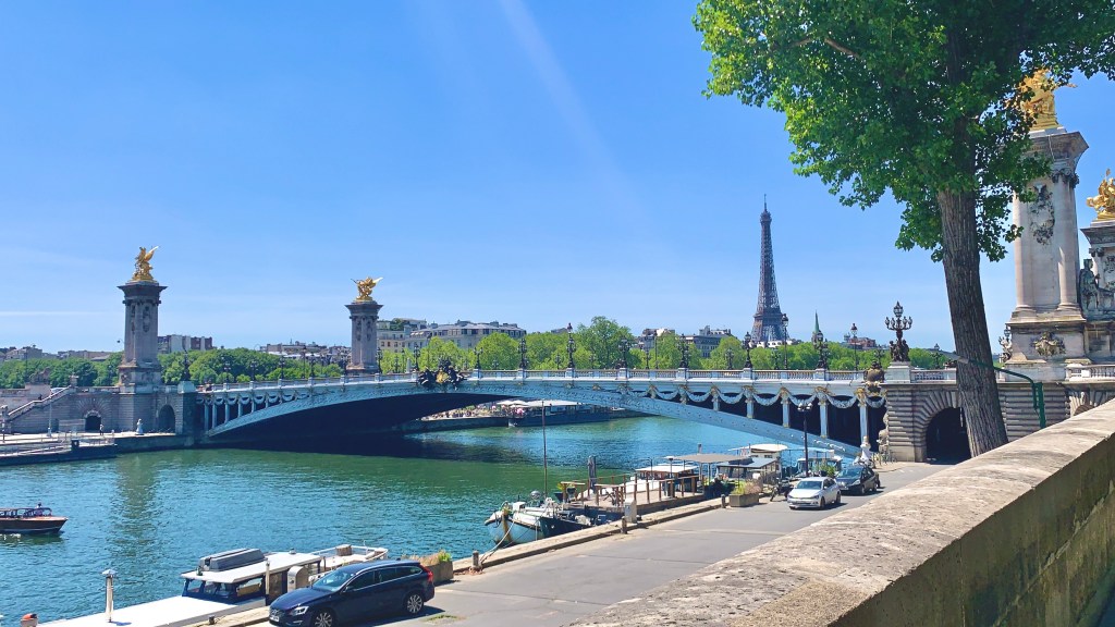 There was a cafe right there in the courtyard so we got a table at Le Cafe Marly, and ordered something quick. We both downed a large water, ordered more, and were grateful for shade and a breeze. I ordered a regular club sandwich for a very expensive price. I started getting anxious about making it back in time since the hotel was now 3+ miles away and we still didn’t have food. Nearly as soon as the thought left my head the food was delivered. It was good, luckily Lewis took one the slices because it turned out to be a good amount, still very overpriced though. We hurried and paid and made it to the bikes (I’m weird and want to get the same bike I just had if it was good) and set out to get to the hotel quickly. The ride along the river was actually really nice and pretty. It’s great how well taken care of their bike routes are.