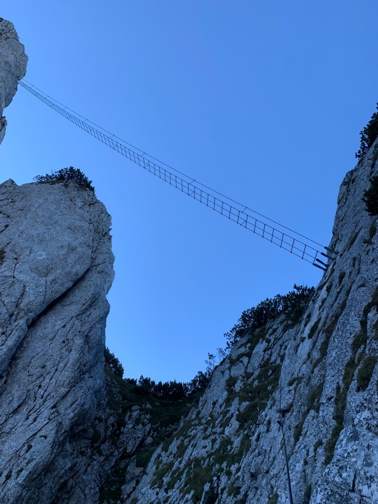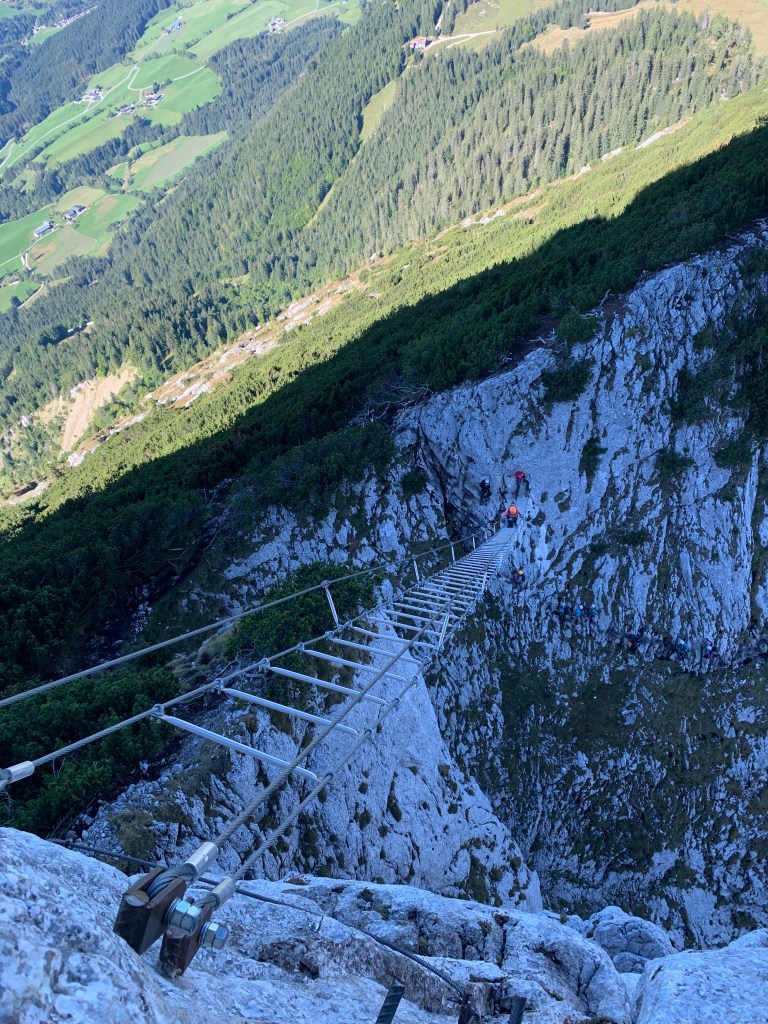 We finally got to the ladder, I was surprised the route went under the start of it so took a break off to the side to rest for a minute. Bri was really struggling at this point and it only made me more nervous. Its definitely scarier once you get to the ladder and realize just how long it is, how high up you are, and how shaky the whole thing is. As we waited the group of 5 people showed up and went straight for the ladder. Bri called her husband for encouragement (and she said a goodbye just in case) and we both made our way back in line and got ready to do the dang thing. I wasn’t scared when I first started (hence me saying “Well Full Send”), I was still excited I was finally doing it… until I had to unclip the first time. The steps are horizontal poles attached to two cables on each side and the hand cables have vertical poles keeping the hand cables sturdy so every so often you have to unclip and reclip to get into the next section. I was not prepared for how scary that would be. I wouldn’t say I’m scared of heights. I love a thrill – I laughed the whole time I went skydiving because I was so happy to be doing it. But this ladder… I was terrified. I couldn’t believe how scared I was and prayed out loud the whole way up. My head didn’t move. I didn’t look at my feet, I didn’t stare straight at my hands, I didn’t look through the ladder, I genuinely have no idea what I was looking at now that I think about it. I shakily got my eighth hand to I clip and recoup and then stared at my left hand wondering how on earth I was supposed to do this again and again. I walked up it with the clips in front of my hands so I didn’t have to reach back for them but it never got easier. In fact, I was halfway across the ladder when the guy ahead of me was getting off and it took everything I had (and lots of out loud praying) for me to stay calm while the ladder shook as he moved around.
