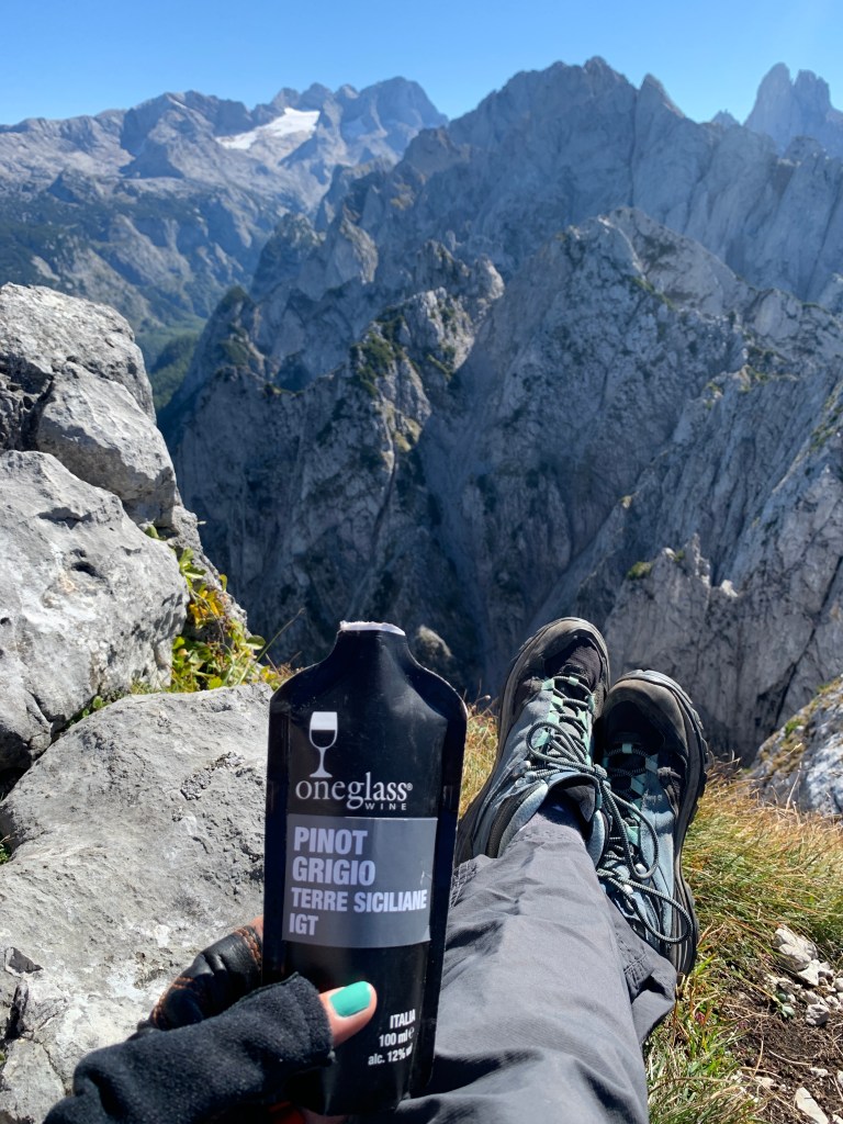 It was just after noon so we had our sandwhiches we’d made at breakfast at the hutte, some melted Reece’s and a single serve ‘box’ wine to cheers the moment. We enjoyed the sunshine and the amazing views for a while.