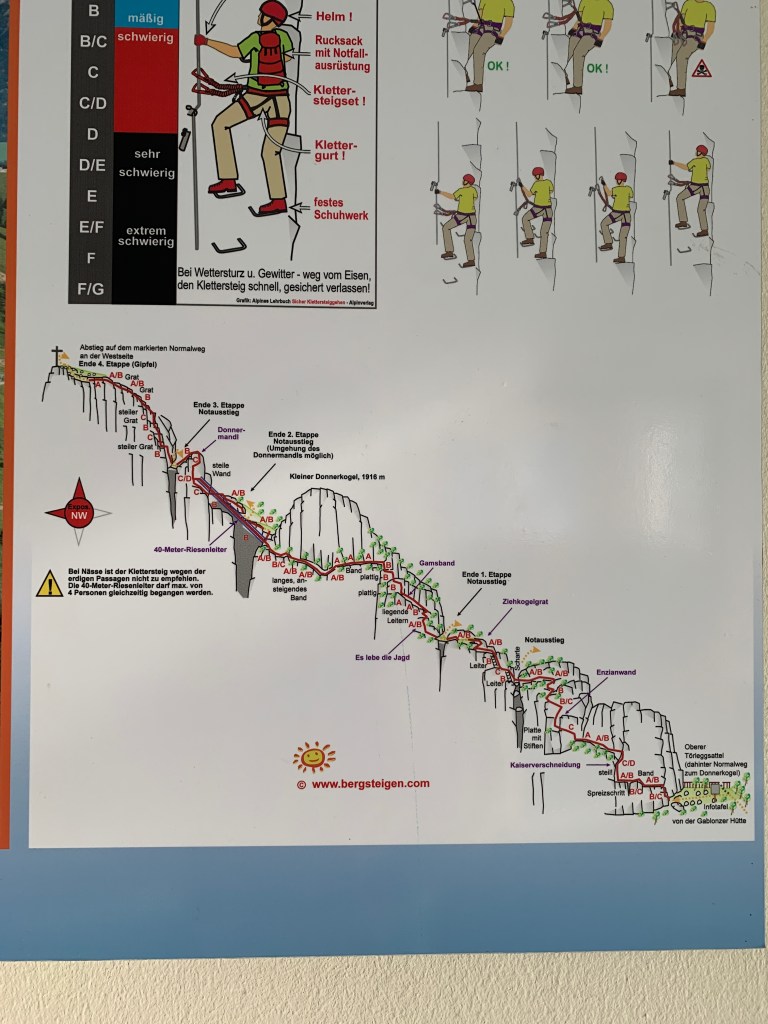 The route is listed with A/B, some B/C, and some C/D difficulty level (see the red line route in a photo below). It didn’t start out hard but we did realize we’d need to save our energy. Most blogs say its a 3 hour climb… in all it took us 4 from the start to the cross but we didn’t rush, and we watched several people go one at a time across the bridge which took a while.
