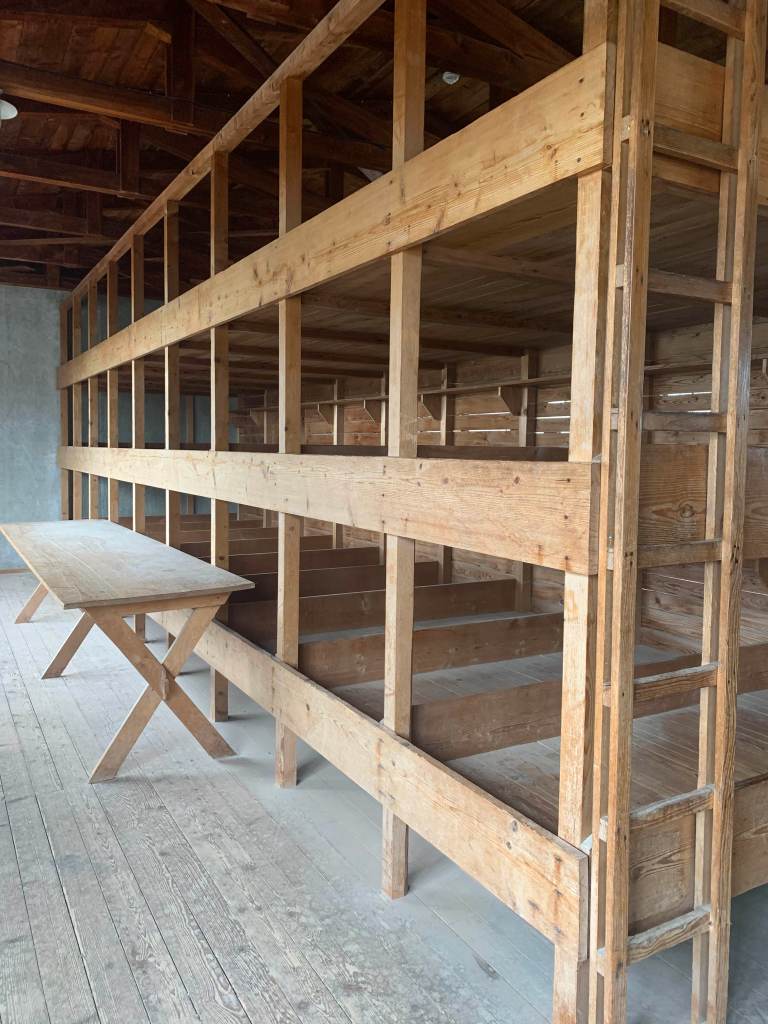 Main walk way down a street like row that was between all the barracks buildings, and photo of the sleeping quarters in the barracks. Note that the barracks are rebuilt as all the original barracks were destroyed. Today, two structures stand which were fully rebuilt exactly as before so we can walk through them but they are not original.