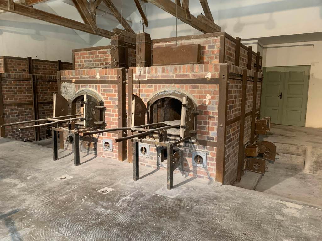 Before this first photo was a room where they were instructed to remove all clothing because they were going to take a shower. Through this solid metal door onto the brick floor they entered preparing for water to fall however they were murdered by gas. After the screaming ended, workers opened the doors and removed the dead bodies. The second photo was fire chambers that were in the next room where the dead bodies were put in to burn, one after another.