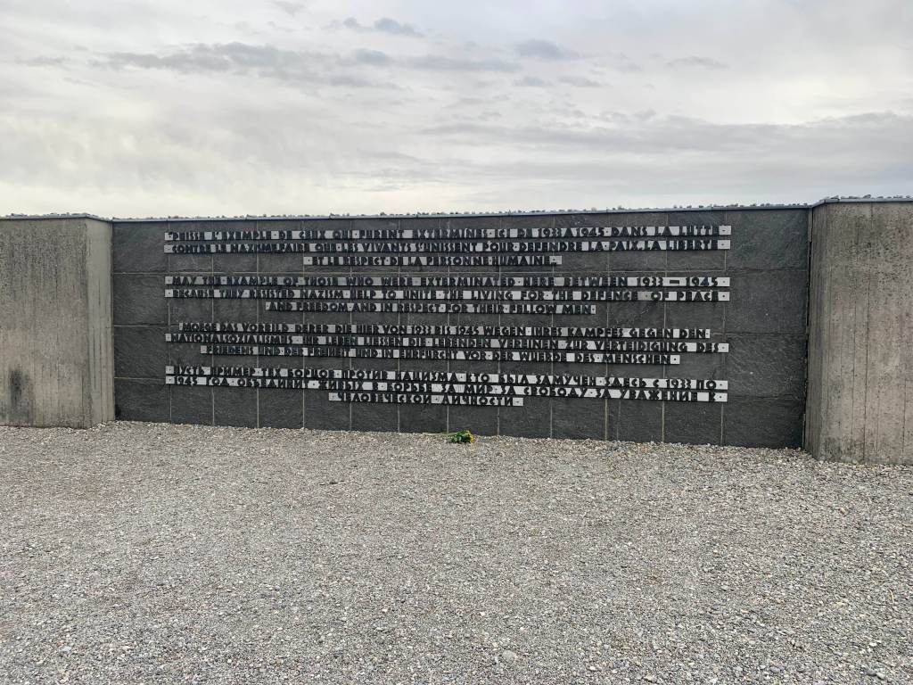 The sign entering the grounds, a wall with several languages which reads: May the example of those who were exterminated here between 1933-1945 because they resisted nazism help to unite the living or the defence of peace and freedom and in respect for their fellow men.